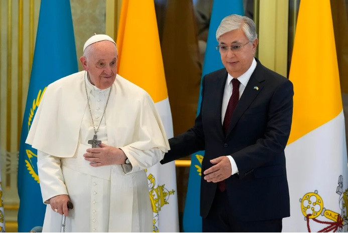 President Kassym-Jomart Tokayev greeted the pope briefly at the airport before the pope travelled in a small white car to the gleaming marble presidential palace for a private meeting with the head of state.