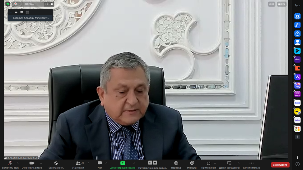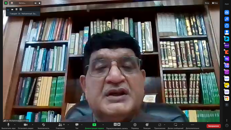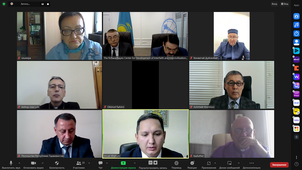 Online conference was attended by following participants Chairman of the Managing Board B. Sarsenbayev , Deputy Chairman of Religious Affairs Committee of the Ministry of Information and Social Development of the Republic of Kazakhstan A. Khatiyev, IRCICA General Director Dr. Mahmud Erol Kilic, Mufti and Chairman of the Ulema Council of the Islamic Center of the Republic of Tajikistan S. Abdukodirzoda, Director General of the Islamic Research Institute at the International Islamic University of Islamabad Muhammad Zia Ul Haq, counsellor of the Embassy of the Republic of Tajikistan to the Republic of Kazakhstan S. Rajabov, Deputy Chairman of the Spiritual Board of Muslims of Uzbekistan U. Gafurov, Chairman of the Conference of Catholic Bishops of Central Asia, Bishop Ordinarius of the Diocese of the Most Holy Trinity in Almaty, Bishop Jose Luis Mumbiela Sierra, Adviser of the Chairman of the Spiritual Administration of Muslims of Kazakhstan K. Duysenbai, Specialist in Social Sciences and Humanities of the UNESCO Cluster Office in Central Asia M. Baibekov, Head of the Center for Interreligious Dialogue of the Bulgarian Islamic Academy E. Sadykova and other experts.