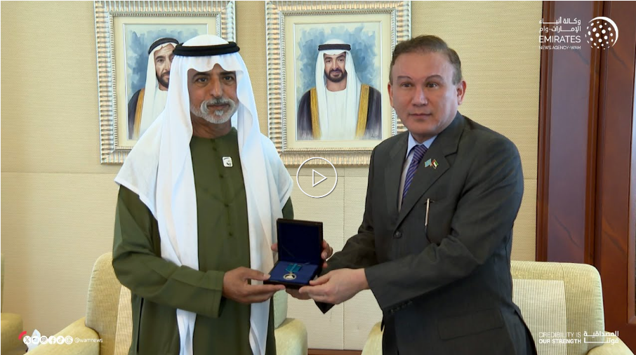 Sheikh Nahyan received the medal today in Abu Dhabi from the Ambassador of Kazakhstan to the UAE, Najmedin Mukhametaliuly, on behalf of President Kassym-Jomart Tokayev.