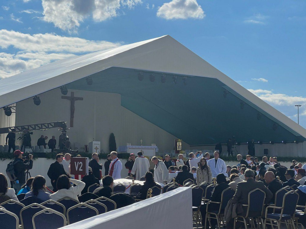 Діни мессаға келушілер қарасының басы жиналып жатыр. Месса 1-1,5 сағаттан кейін басталады. Медицина қызметкерлері мен тәртіп сақшылары, төтенше жағдай қызметкерлері де осында.