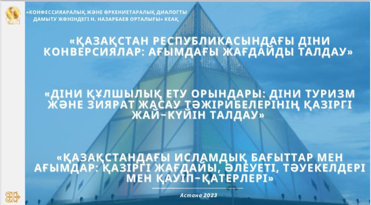 Биыл 7 желтоқсанда Конфессияаралық және өркениетаралық диалогты дамыту жөніндегі Н. Назарбаев орталығы «Қазақстан Республикасындағы діни конверсиялар: ағымдағы жағдайды талдау», «Діни құлшылық ету орындары: діни туризм және зиярат жасау тәжиірибелерінің қазіргі жай-күйін талдау», «Қазақстандағы исламдық бағыттар мен ағымдар: қазіргі жағдайы, әлеуеті, тәуекелдері мен қауіп-қатерлері» атты үш зерттеу жобаларының нәтижелері бойынша онлайн презентация ұйымдастырды.