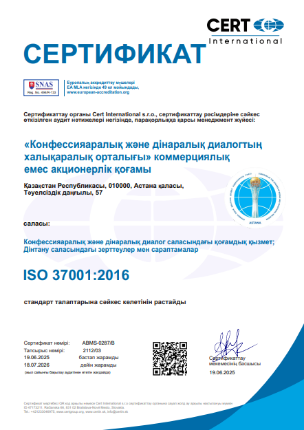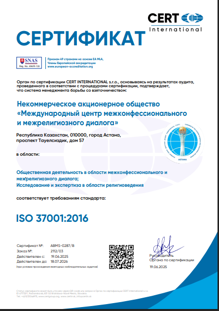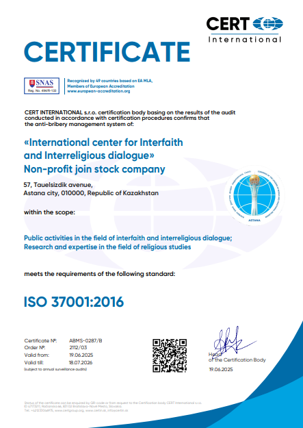 2025 жылдың 23-24 маусымында «Конфессияаралық және дінаралық диалогтың халықаралық орталығы» КЕАҚ жемқорлыққа қарсы іс-қимыл саласындағы халықаралық стандарт – ISO 37001:2016 стандартына сәйкестігі бойынша менеджмент жүйесінің халықаралық сертификаттауынан сәтті өтті.