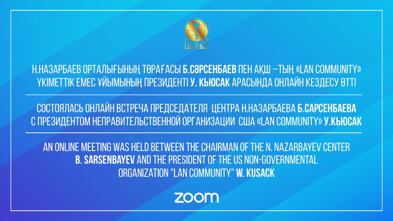 14 апреля т.г. состоялась онлайн встреча Председателя Центра Н.Назарбаева Б.Сарсенбаева с Президентом неправительственной организации США "LAN Community" У.Кьюсак.