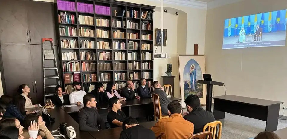 На базе факультета богословия Ереванского государственного университета состоялся показ документального фильма «Сила притяжения Казахстана». Показ был приурочен к XXI заседанию Секретариата Съезда лидеров мировых и традиционных религий, которое прошло сегодня в Астане. В мероприятии приняли участие представители профессорского-преподавательского состава, студенты и слушатели факультета богословия ЕГУ.