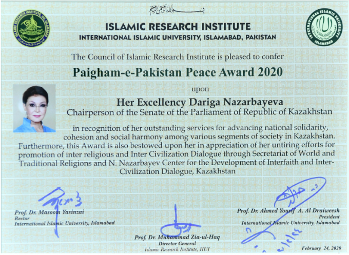 Председателю Сената Парламента РК Дариге Назарбаевой вручили премию мира "Paigham-e-Pakistan" 2020 от имени Совета Исламского Исследовательского института (Исламабад, Пакистан), передает zakon.kz.